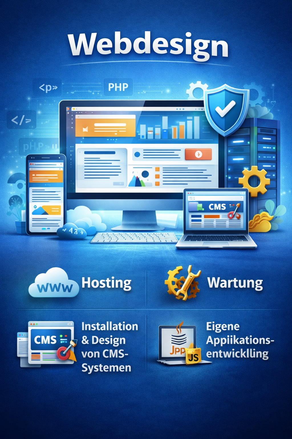 Wir bieten Ihnen ganzheitliches Webdesign – von der stabilen technischen Basis bis zur individuellen Umsetzung: